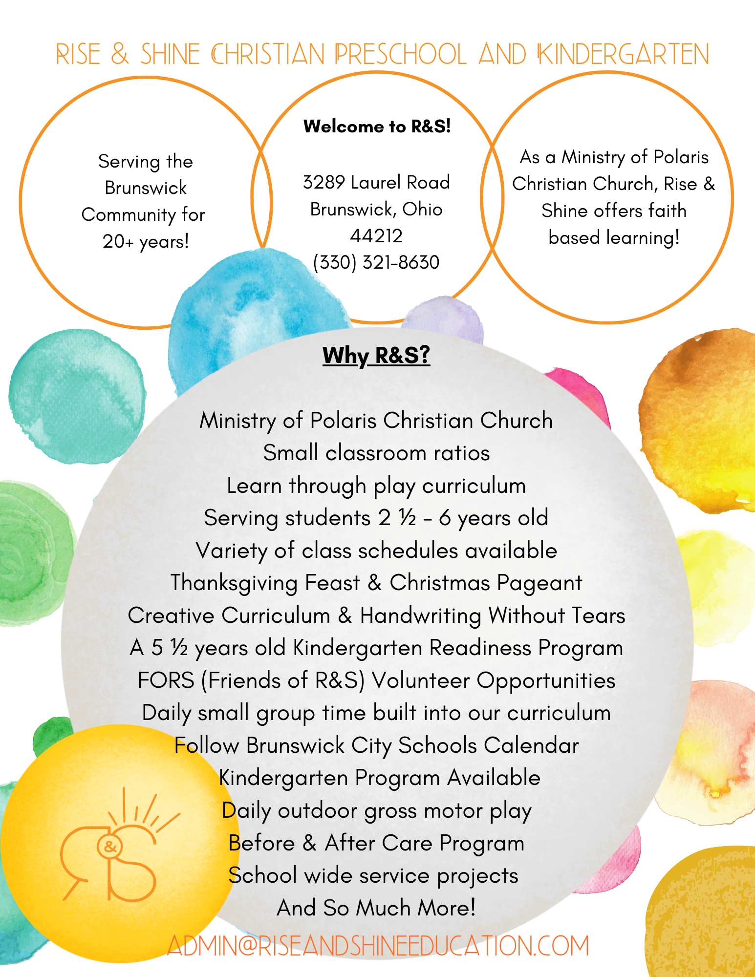 Rise and Shine provides a loving, supportive, and safe environment where children will establish a foundation for learning in kindergarten and beyond, and learn about God’s awesome love and how to live out Christ’s example.